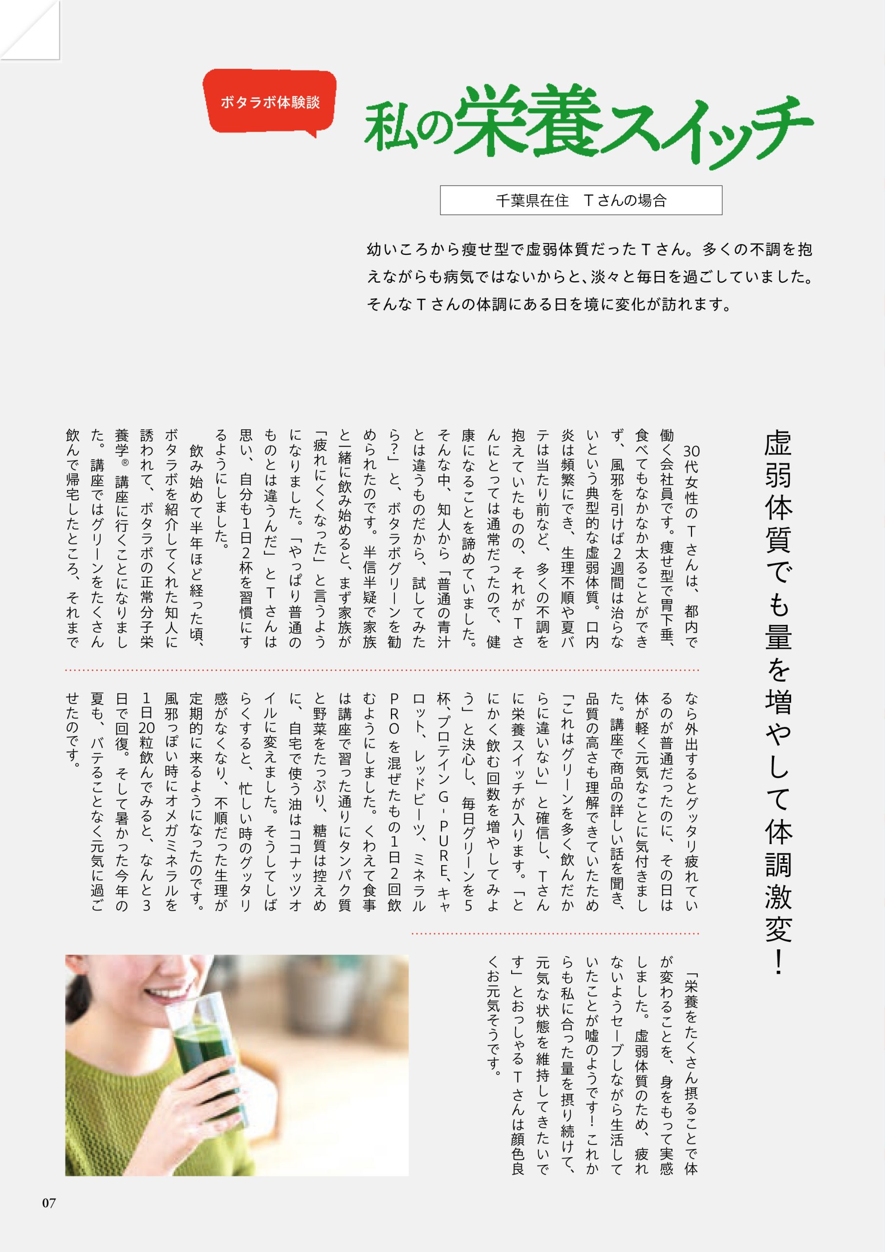 ボタニック・ラボラトリーは、「人々の健康長寿人生に貢献する」という理念に基づき、食や栄養の大切さを一人でも多くの人に知ってもらうために、健康相談やセミナーの開催、健康サポート製品の販売を行っている会社です。